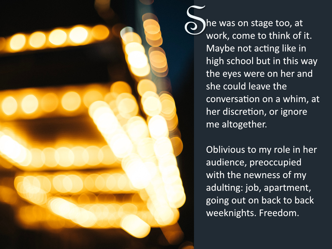 She was on stage too, at work, come to think of it. Maybe not acting like in high school but in this way the eyes were on her and she could leave the conversation on a whim, at her discretion, or ignore me altogether.