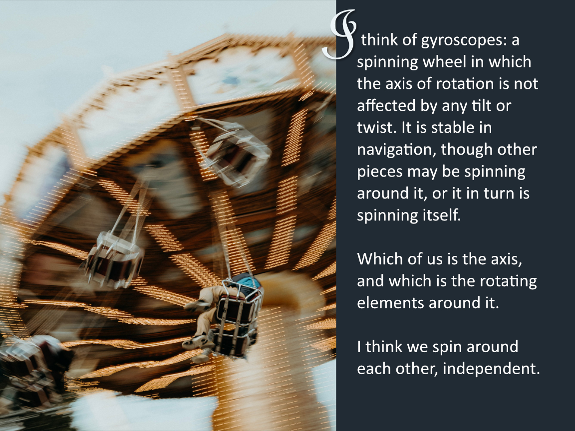 I think of gyroscopes: a spinning wheel in which the axis of rotation is not affected by any tilt or twist. It is stable in navigation, though other pieces may be spinning around it, or it in turn is spinning itself. Which of us is the axis, and which is the rotating elements around it. I think we spin around each other, independent.