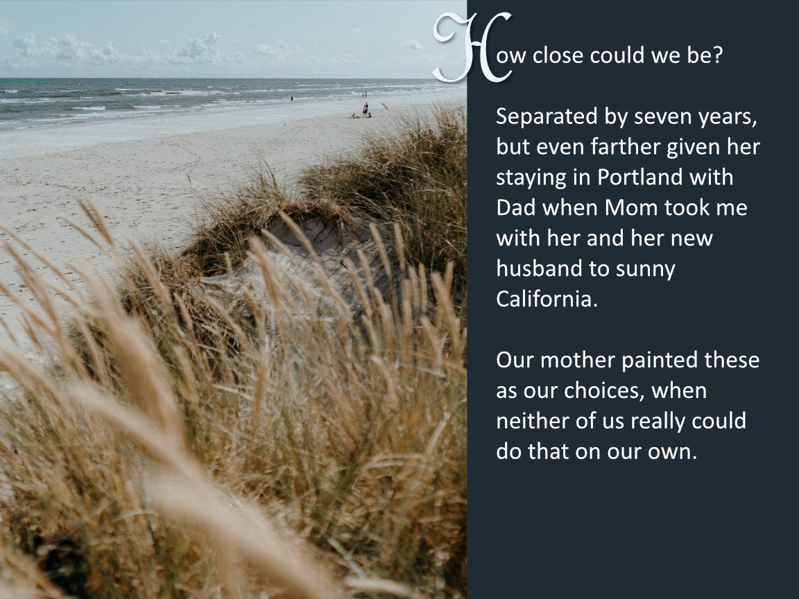 How close could we be? Separated by 7 years, but even farther given her staying in Portland with Dad when Mom took me with her and her new husband to sunny California.