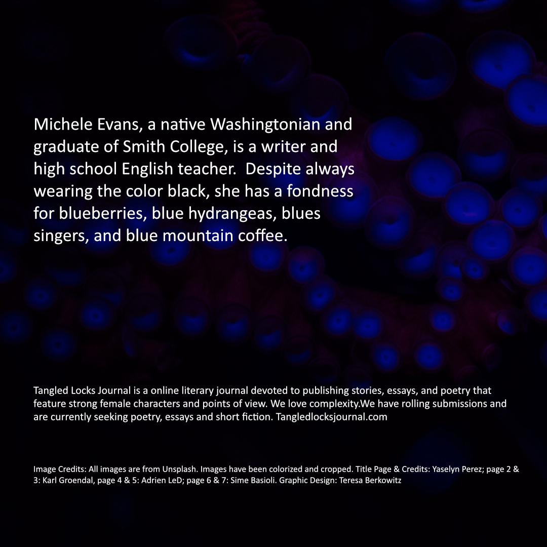 Michele Evans, a native Washingtonian and graduate of Smith College, is a writer and high school English teacher. Despite always wearing the color black, she has a fondness for blueberries, blue hydrangeas, blues singers, and blue mountain coffee.
