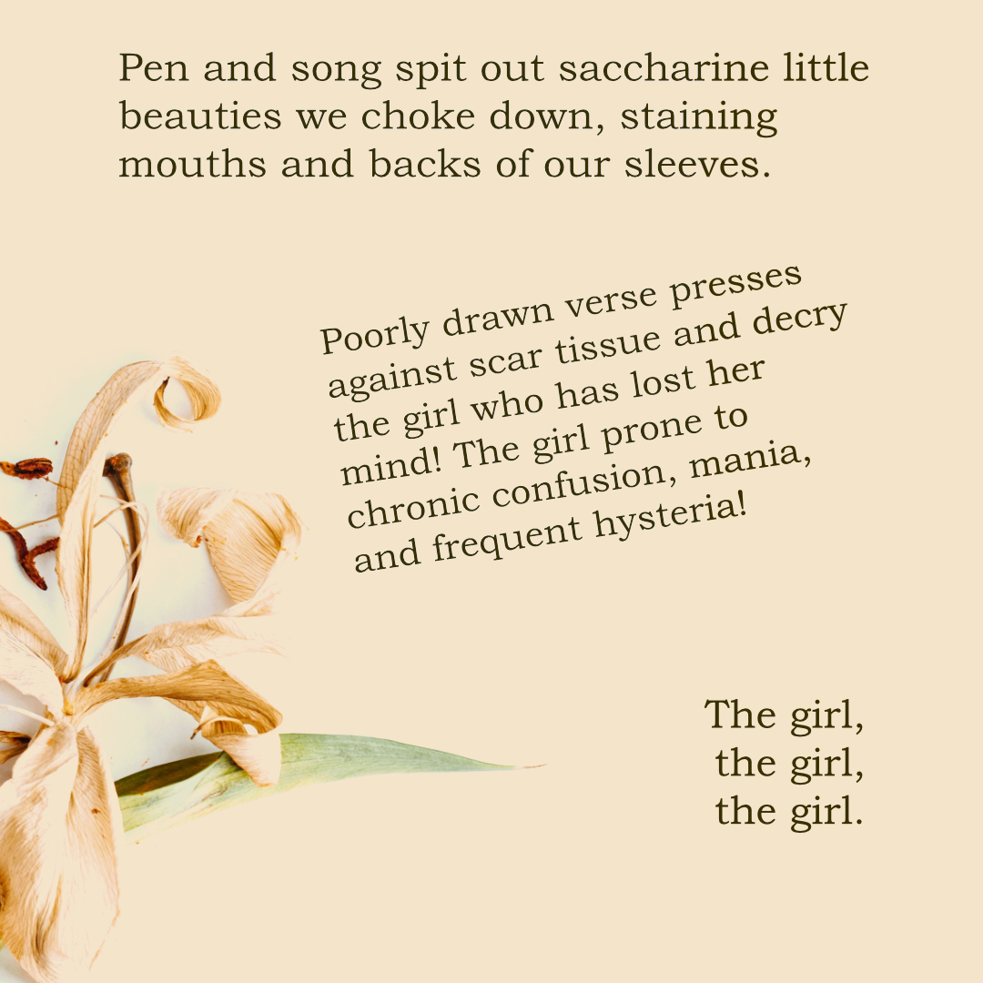 Pen and song spit out saccharine little beauties we choke down, staining mouths and backs of our sleeves. Poorly drawn verse presses against scar tissue and decry the girl who has lost her mind! The girl prone to chronic confusion, mania, and frequent hysteria! The girl, the girl, the girl.