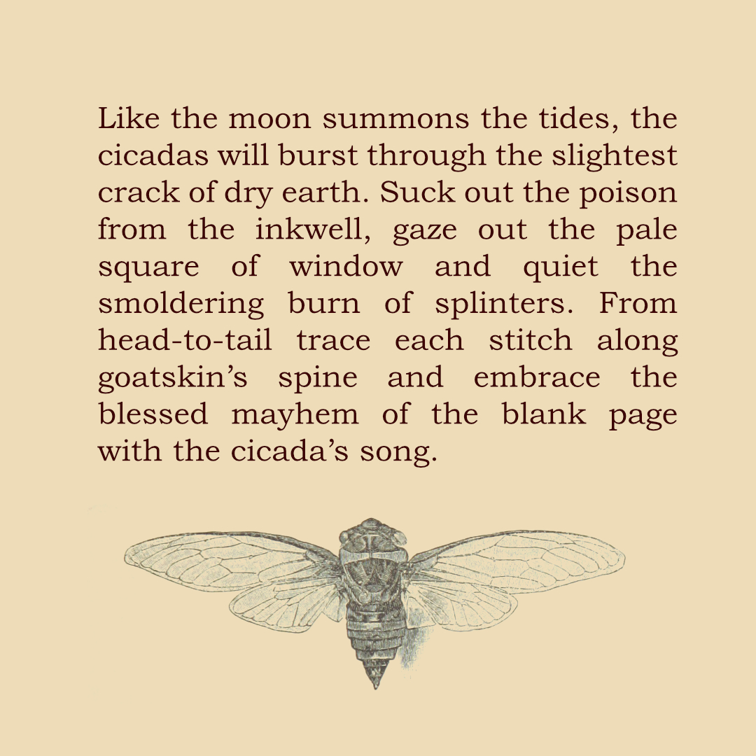 Like the moon summons the tides, the cicadas will burst through the slightest crack of dry earth. Suck out the poison from the inkwell, gaze out the pale square of window and quiet the smoldering burn of splinters. From head-to-tail trace each stitch along goatskin’s spine and embrace the blessed mayhem of the blank page with the cicada’s song.