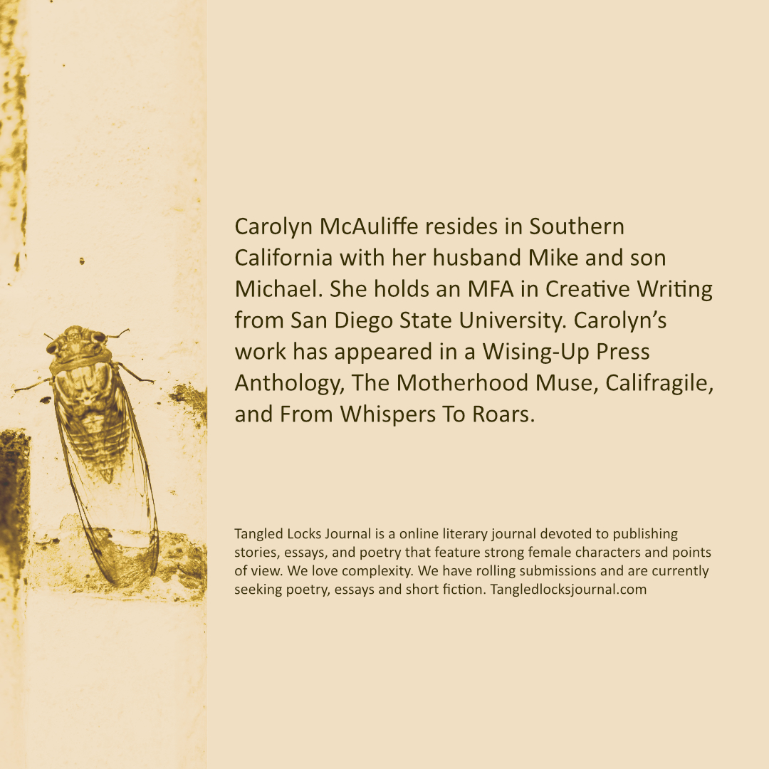 Carolyn McAuliffe resides in Southern California with her husband Mike and son Michael. She holds an MFA in Creative Writing from San Diego State University. Carolyn’s work has appeared in a Wising-Up Press Anthology, The Motherhood Muse, Califragile, and From Whispers To Roars.