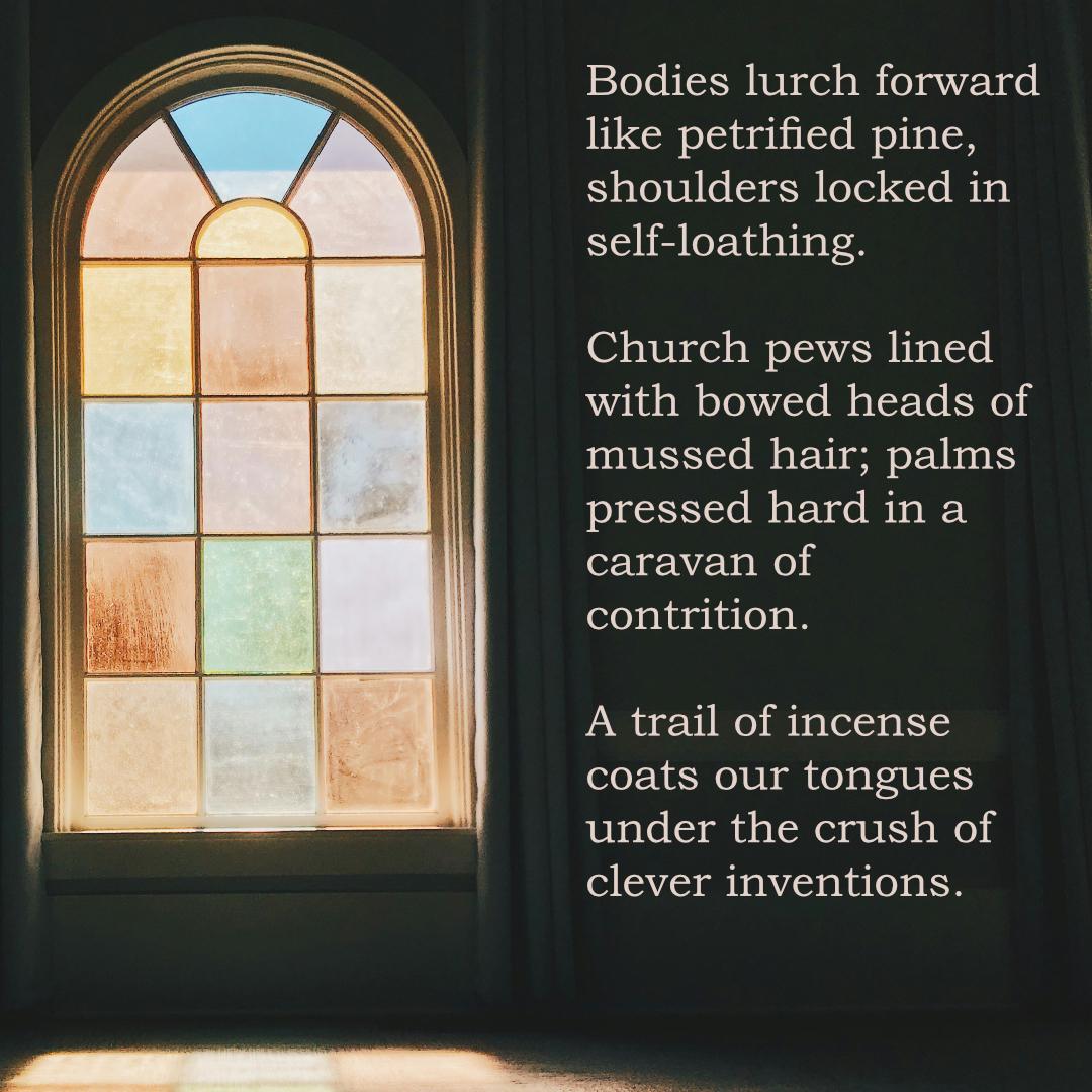 Bodies lurch forward like petrified pine, shoulders locked in self-loathing. Church pews lined with bowed heads of mussed hair; palms pressed hard in a caravan of contrition. A trail of incense coats our tongues under the crush of clever inventions.