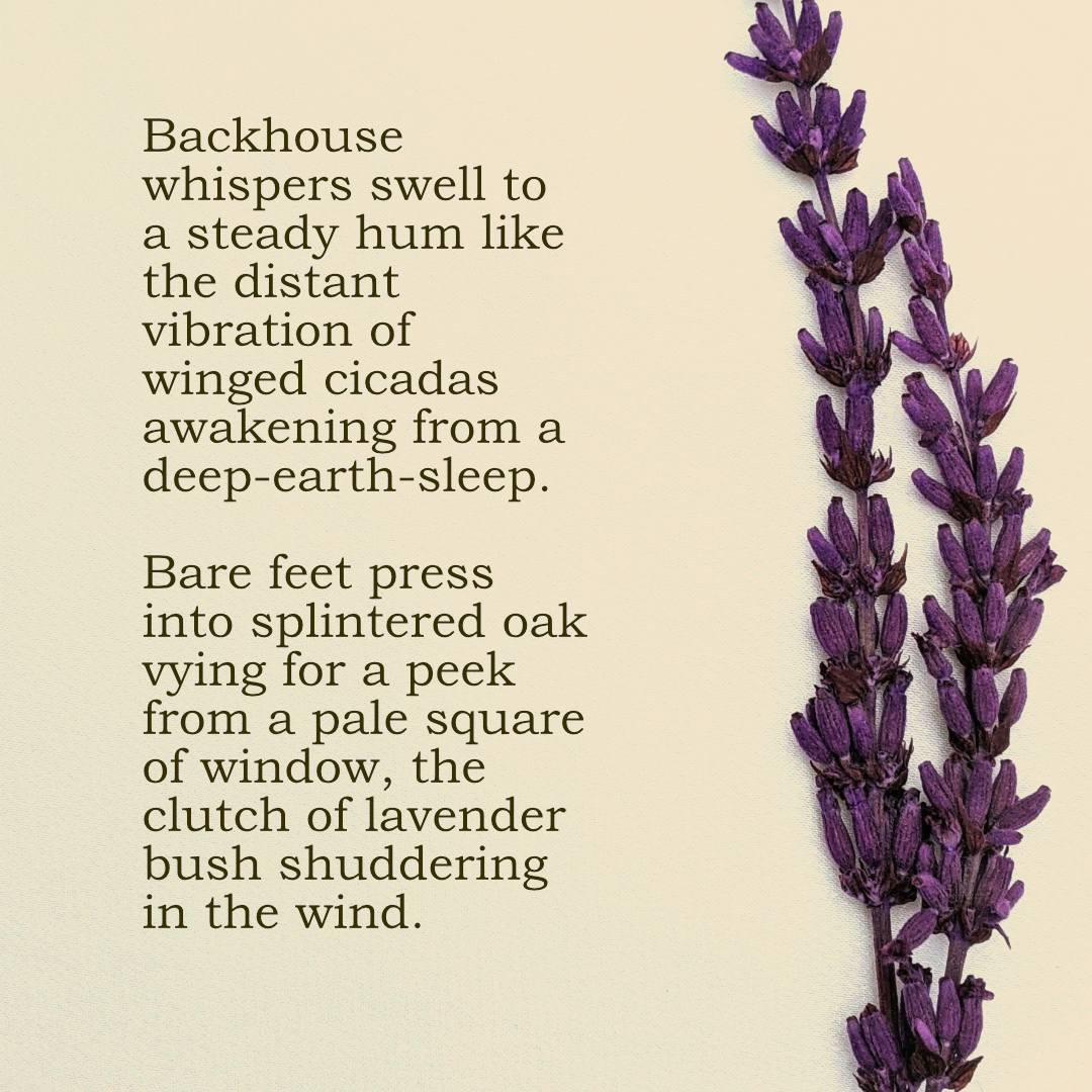 Backhouse whispers swell to a steady hum like the distant vibration of winged cicadas awakening from a deep-earth-sleep. Bare feet press into splintered oak vying for a peek from a pale square of window, the clutch of lavender bush shuddering in the wind.