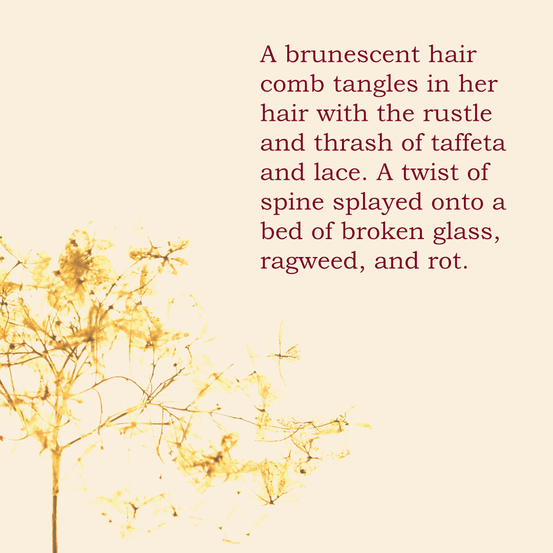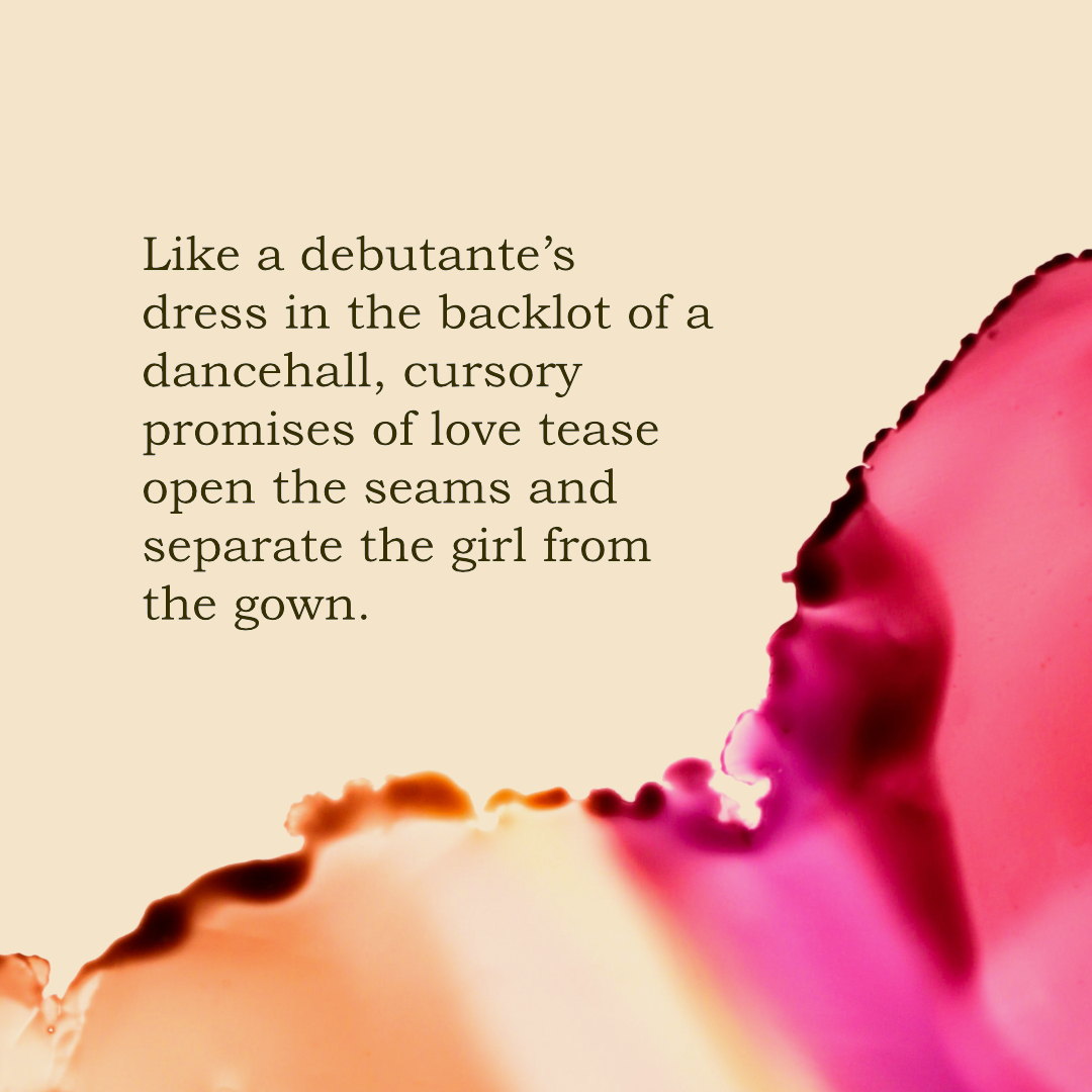 Like a debutante’s dress in the backlot of a dancehall, cursory promises of love tease open the seams and separate the girl from the gown. A brunescent hair comb tangles in her hair with the rustle and thrash of taffeta and lace. A twist of spine splayed onto a bed of broken glass, ragweed, and rot.