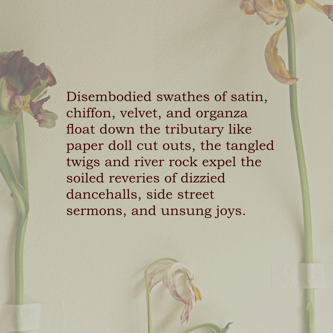 Disembodied swathes of satin, chiffon, velvet, and organza float down the tributary like paper doll cut outs, the tangled twigs and river rock expel the soiled reveries of dizzied dancehalls, side street sermons, and unsung joys.